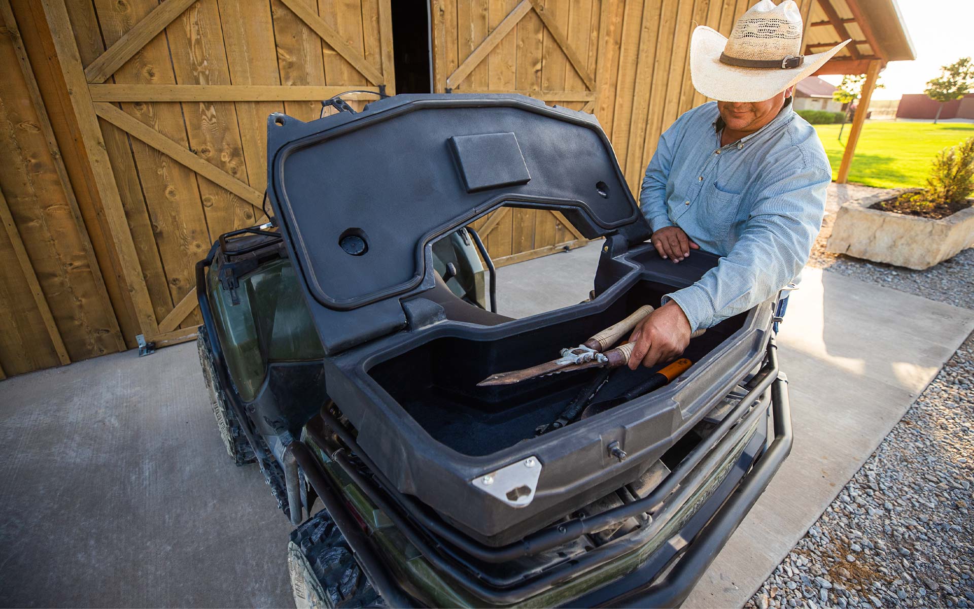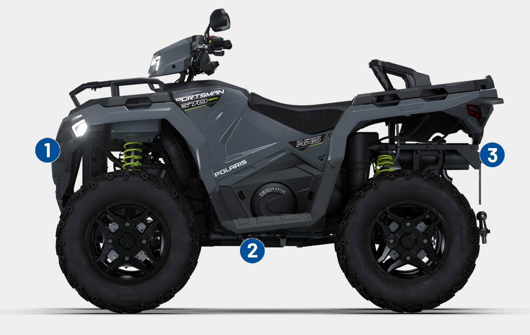 12-Volt-Steckdose, Ladeanschluss im Pod, PIN-aktiviertes Sicherheitssystem (P.A.S.S.), Front- und Heckgepäckträger-Erweiterung, Windenhalterung enthalten, Frontstoßfänger